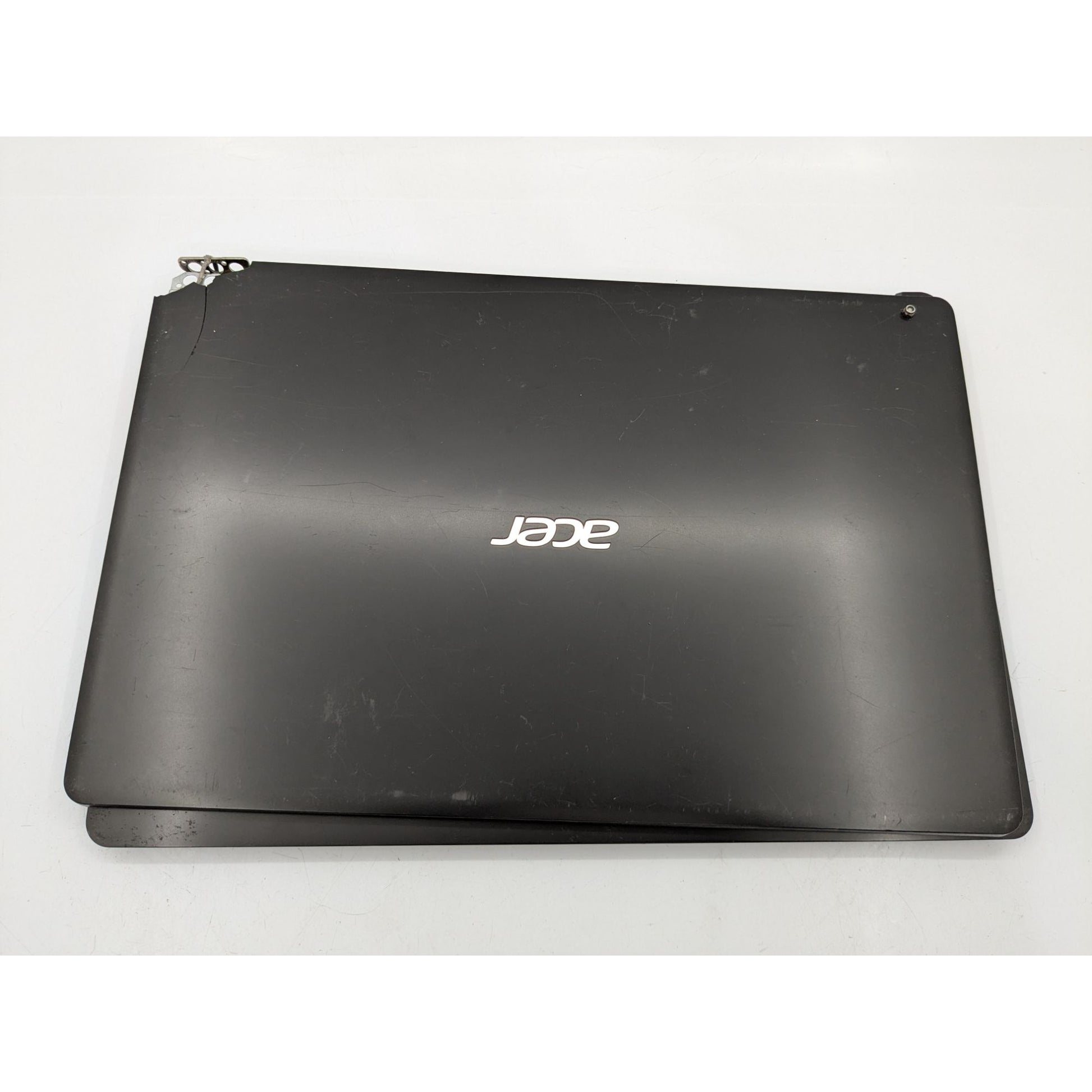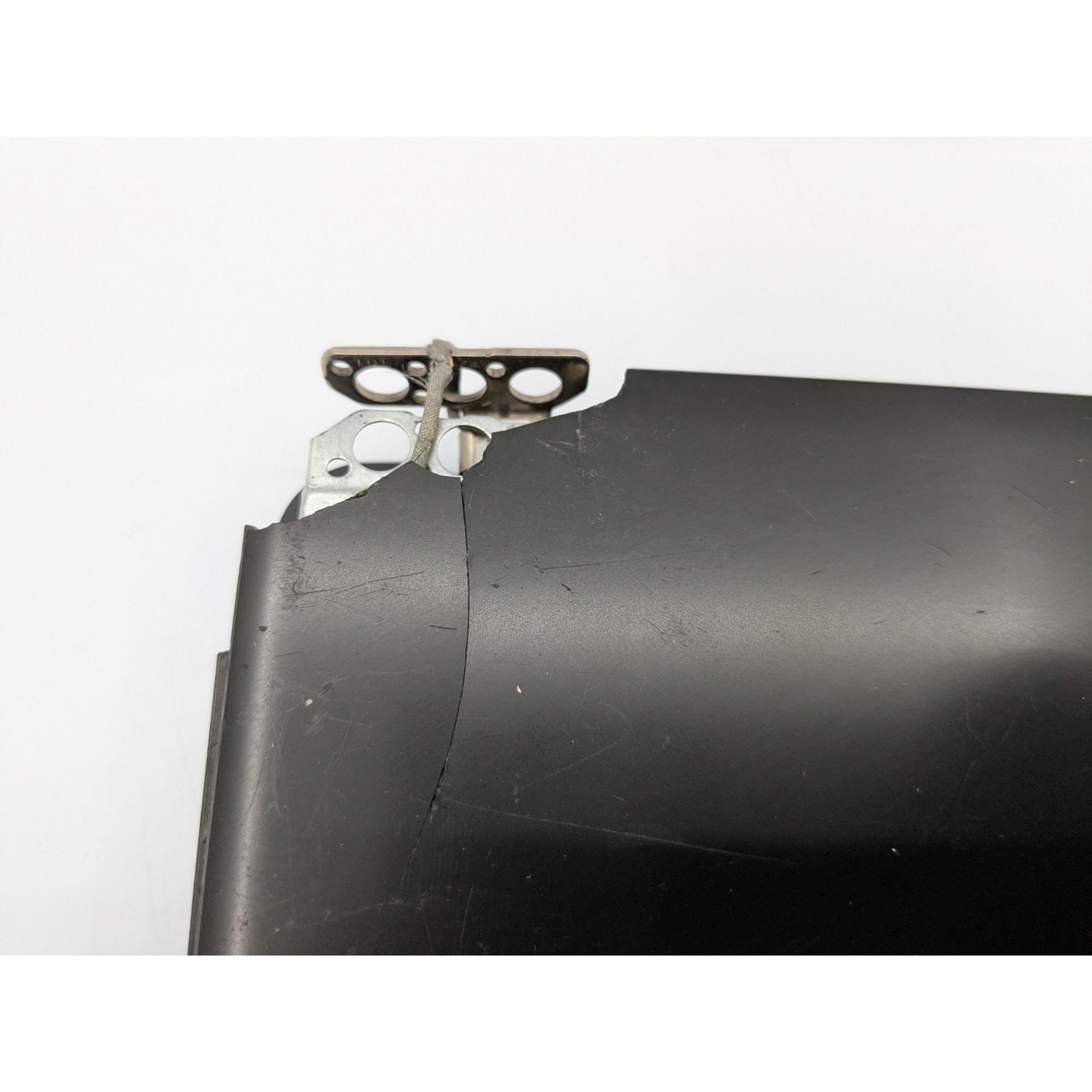 Broken hinge, screen frame and lid damage; white marks and scratches evident on display.